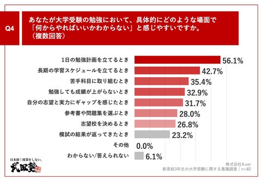Q1で「非常にそう感じている」「やや感じている」「あまり感じていない」と回答した方に、「Q4.あなたが大学受験の勉強において、具体的にどのような場面で『何からやればいいかわからない』と感じやすいですか。(複数回答)」(n=82)と質問したところ、「1日の勉強計画を立てるとき」が56.1%、「長期の学習スケジュールを立てるとき」が42.7%、「苦手科目に取り組むとき」が35.4%という回答となりました。