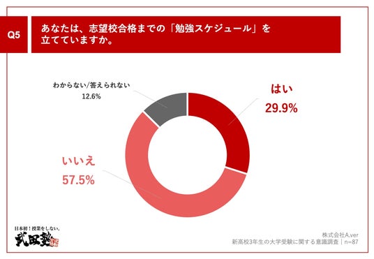 Q1で「大学受験はしない」以外を回答した方に、「Q5.あなたは、志望校合格までの『勉強スケジュール』を立てていますか。」(n=87)と質問したところ、「はい」が29.9%、「いいえ」が57.5%という回答となりました。