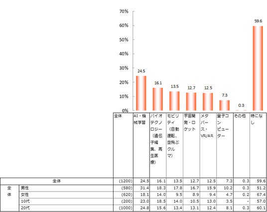 また、興味がある最先端技術の分野を伺ったところ、「特になし」が全体の約6割を占めた。「AI・機械学習」が全体で24.5%、性別では男性が31.4%となり、女性(18.1%)よりも13.3ポイント高い。