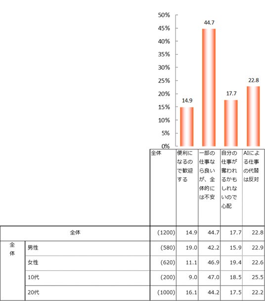 AI(人工知能)が人間の仕事を代替することについて、「一部の仕事なら良いが、全体的には不安」が全体の44.7%でトップ、次いで「AIによる仕事の代替は反対」が22.8%、「自分の仕事が奪われるかもしれないので心配」が17.7%だった。合わせると、不安視する人が8割超となった。一方、「便利になるので歓迎する」は14.9%と最も低かった。