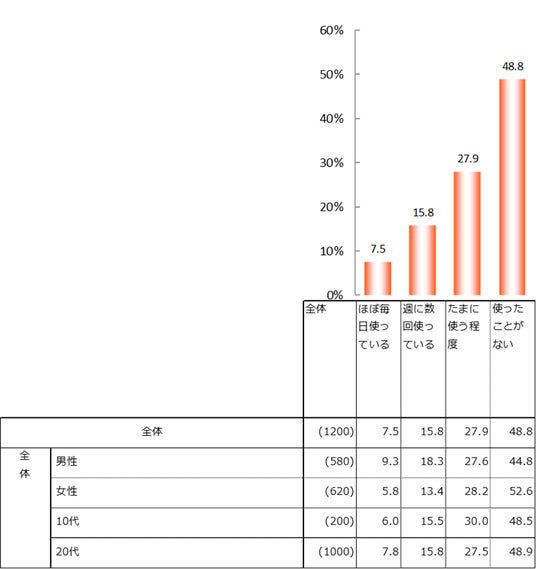 生成AI(ChatGPT、画像生成AIなど)の使用頻度について、「ほぼ毎日使っている」(7.5%)、「週に数回使っている」(15.8%)、「たまに使う程度」(27.9%)の合計が過半数を占めた。Z世代の2人に1人が生成AIを使用していることが分かった。「使ったことがない」が全体の48.8%だった。