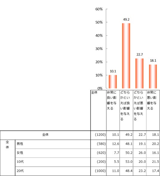 また、AIが今後の社会に与える影響について、「どちらかといえば良い影響を与える」が全体の49.2%で約半数を占めた。「非常に良い影響を与える」(10.1%)と合わせると59.3%となり、肯定的に捉える人の方が多かった。