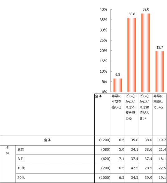 テクノロジーの発展に対して、「どちらかといえば期待が大きい」が全体の38.0%でトップ、次いで「どちらかといえば不安を感じる」が35.8%、「非常に期待している」が19.7%となった。期待する層は57.7%となり、不安を感じる層(42.3%)を上回った。