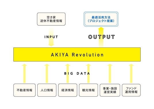 AKIYA Revolutionは、人口や経済、観光入込客数などの地域情報、用途地域や地区計画、防火・準防火地域などの法令制限に関するデータ、登記簿や地番、路線価や公示価格などの不動産に関係するオープンデータ、築年数、構造、リノベーション(改修)コスト、運営人件費など、当該エリアに関するあらゆるデータを集約し、物件を指定すると最適な活用方法(不動産であれば想定売却価格、賃貸であれば想定賃料、事業であれば、宿が良いかシェアオフィスなのかカフェなのかの想定事業収支)をレコメンドするサービスです。AKIYA Revolutionにより、空き家等遊休不動産の利活用が促進され、空き家問題解決の一助になるだけでなく、地域での起業創出機会を広げ、地域活性・地方創生に繋がることを期待しています。