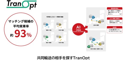共同輸送実現にあたっての最大のハードルは、「共同輸送の相手を探す」ことであり、TranOptはこれに対応するシステムです。発着地点の位置情報だけでなく、積み荷の特性や、季節波動なども加味して最適な相手の候補を提示することができます。共同輸送の相手探しの難しさは、すでに多くの企業が実感しているいわば「顕在化した」ニーズでもあります。