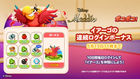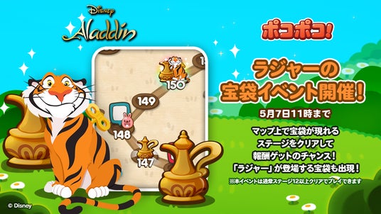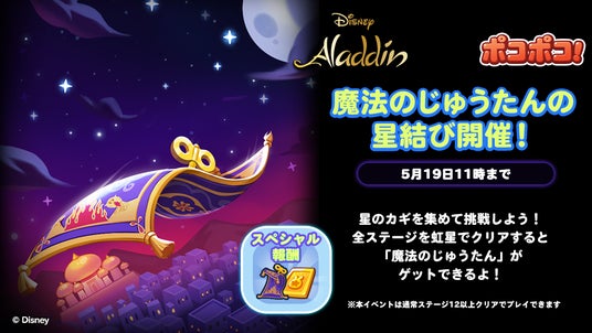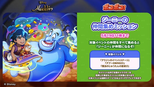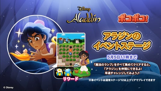 LINEヤフー株式会社は、当社が展開する3マッチパズルゲーム「LINE ポコポコ」(iPhone・Android対応/無料)にて、ディズニーの『アラジン』が登場するイベントとキャンペーンを開催します。