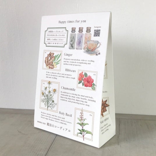 コーディアルは、体質別に考えられ、ブレンドされた4種類が発売されています。含まれるハーブやスパイスの種類は、多いもので10種類以上にのぼります。複雑な配合が、飲んだことない味がする、でも「美味しい」と言われる作りであること、そして飲んだ瞬間から「あれ?」と何かを感じる人が多いことから、「魔法のような飲料」と評価されています。