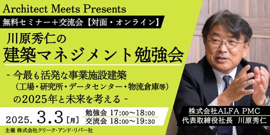 株式会社クリーク・アンド・リバー社(C&R社)が運営するクリエイティブやビジネスの共創と創発を生み出すFacebookコミュニティ『Architect Meets』は、3月3日(月)、建築業界で活躍する方々を対象に、セミナー「川原秀仁の建築マネジメント勉強会~今最も活発な事業施設(工場・研究所・データセンター・物流倉庫等)建築の2025年と未来を考える~」を開催します。なお、本セミナーは対面・オンラインのハイブリット開催を予定しており、対面開催では交流会も予定しています。