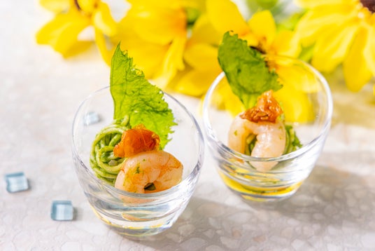 爽やかに香る大葉をたっぷりと使用し、和風にアレンジした冷製ジェノベーゼ。凝縮された甲殻類のビスクを加え、奥深い味わいに仕上げました。