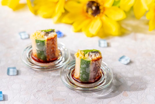 夏のスタミナ食材、鰻を使用した一品。鰻の蒲焼とキュウリ、そして錦糸卵を生春巻きスタイルで。山椒を効かせた特製タレが、食欲をそそります。