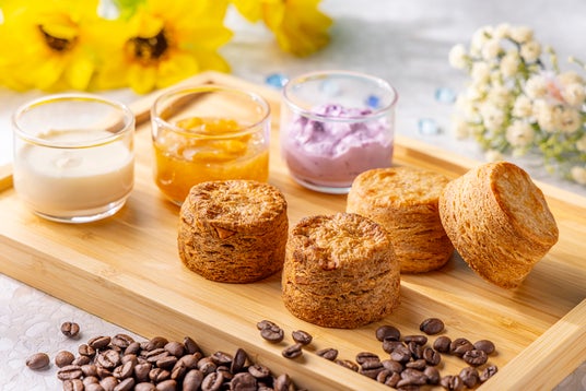スコーンは、定番のプレーンに加え、期間限定のコーヒーとマカダミアナッツのスコーンをご用意しました。コーヒーの香ばしい風味とほのかな苦み、そしてマカダミアナッツの食感が魅力です。なめらかな口どけのクロテッドクリーム、桃とマンゴーの果肉を贅沢に使ったジャム、そしてブルーベリーコンポートとチーズの特製クリーム。3種類のコンディメントを、お好みの組み合わせでスコーンとともにお楽しみください。