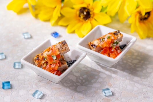 柔らかい肉質で、旨味やコクが詰まった銘柄豚マーガレットポークをタイムやオレガノなどのスパイスでマリネして香ばしくローストしました。BBQの炭火焼をイメージして、炎に見立てたトマトサルサや竹炭のパン粉を添えました。
