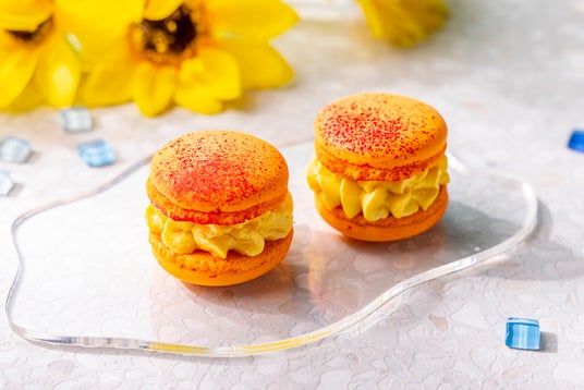 鮮やかなマンゴーカラーと、まるで本物のマンゴーのような模様が目を引く、見た目も楽しいマカロンです。濃厚なマンゴーの香りが広がる、自家製マンゴージャムと、とろけるようなマンゴーバタークリームをたっぷりとサンドしました。