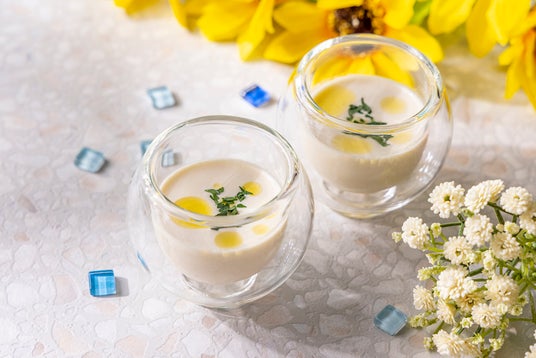スペインのアンダルシア地方の夏の代表料理として知られる“アホ・ブランコ(白いガスパチョ)”。ミルクやアーモンドスライス、オリーブオイルをベースにした栄養満点の冷製スープに、シェリービネガーを入れて味を引き締めました。