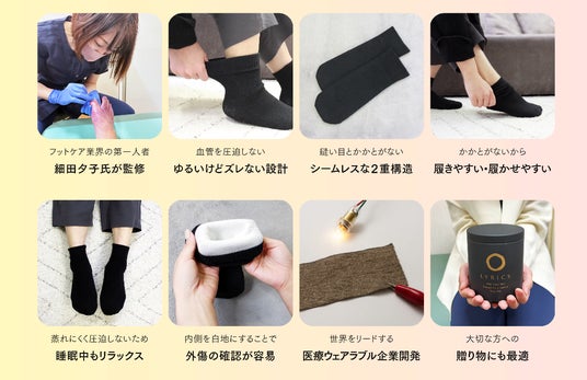 「LYRICS」は、フットケアの第一人者である糖尿病療養指導士の細田夕子氏監修のもと誕生。以下の特長により、足の健康を守ります。