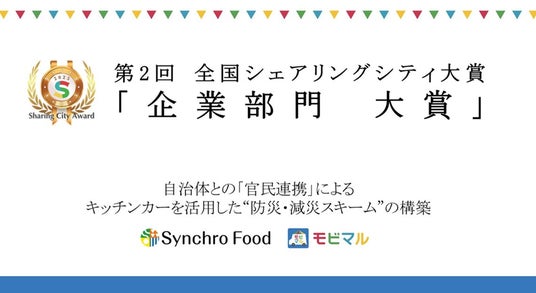株式会社シンクロ・フード(本社:東京都渋谷区、代表取締役:藤代真一、東証プライム市場:3963)が運営する、モビマルは、一般社団法人地域活性化プロジェクト縁GINと連携して取り組んだ「自治体との『官民連携』によるキッチンカーを活用した“防災・減災スキーム”の構築」の取り組みにおいて、「第2回全国シェアリングシティ大賞 (主催: 一般社団法人シェアリングエコノミー協会)」企業部門の大賞を受賞いたしました。