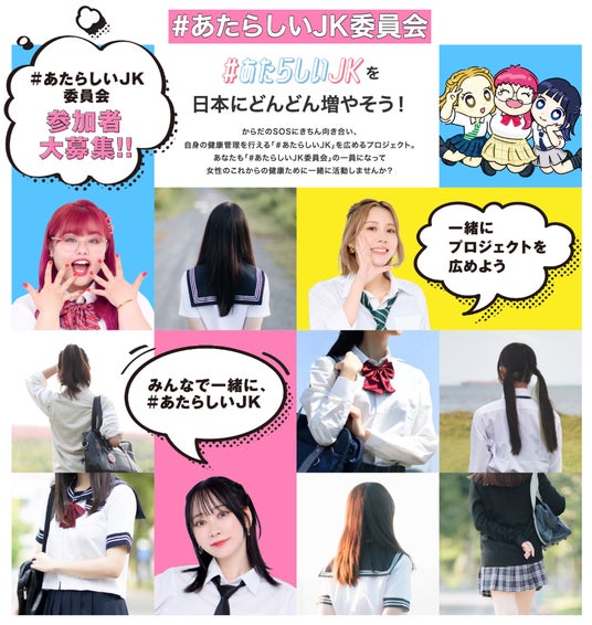 プロジェクトの理念を広く届けるために、公式生徒会「#あたらしいJK委員会」を新たに発足いたします。「#あたらしいJK委員会」は、プロジェクトに共感いただいた10代~20代の学生の皆さまがメンバーとなり、同世代のコミュニティに向けて女性のからだの不調に関する知識や、婦人科受診の大切さを発信していただく活動になります。また、「女性からだ推進大使」としても活動中のくれいじーまぐねっとと連携し、リアルな視点での発信やコラボ企画を通して、婦人科受診やからだのことをもっとオープンに話せる雰囲気づくりを目指します。