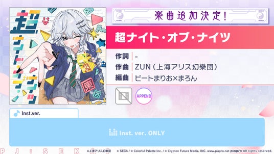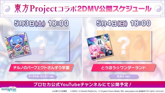 5月3日(土)より、「東方Project」とのコラボ楽曲を順次追加することが決定いたしました。「チルノのパーフェクトさんすう学園」はバーチャル・シンガーver. 、「とうほう☆ワンダーランド」は「ワンダーランズ×ショウタイム」歌唱のセカイver. とバーチャル・シンガーver.、「超ナイト・オブ・ナイツ」はinst ver.を収録予定です。また、「チルノのパーフェクトさんすう学園」は5月3日(土)18:00より、「とうほう☆ワンダーランド」は5月4日(日)18:00より、プロセカ公式YouTubeにて2DMVを公開いたします。