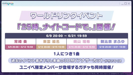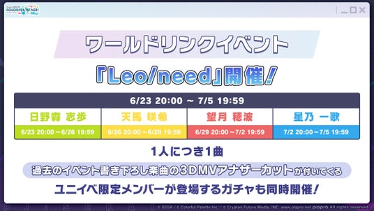 2025年6月9日(月)20:00~6月21日(土)19:59に「25時、ナイトコードで。」、2025年6月23日(月)20:00~7月5日(土)19:59に「Leo/need」の「ワールドリンクイベント」を開催することが決定いたしました。