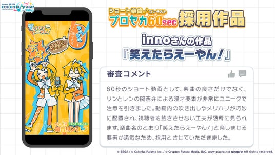 60秒以内のYouTubeショート動画で収録楽曲を決める不定期開催の募集企画「ショート楽曲コンテストプロセカ60sec」の採用作品が、「笑えたらえーやん!」(作詞・作曲:inno)に決定いたしました。採用作品は、ゲームサイズ版を今後リズムゲーム楽曲として追加予定です。