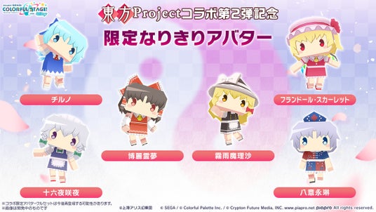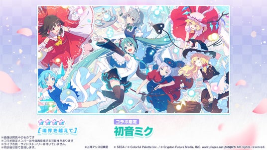 「[東方Projectコラボ記念] コラボ限定★4メンバー確定 幻想郷コレクションガチャ」では、コラボキャラクターの博麗霊夢、霧雨魔理沙、十六夜咲夜、八意永琳、チルノ、フランドール・スカーレットの6名と共演した、コラボ限定メンバー★4初音ミクが必ず登場します。また、本ガチャを引くことで、コラボキャラクター6名の限定なりきりアバターがついてきます。おひとり様一回限りで、有償クリスタル3,000個で引くことができます。