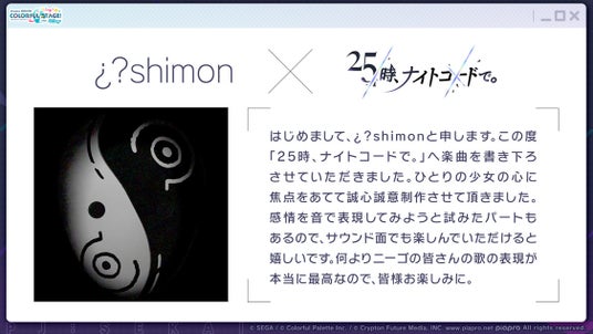 ¿?shimonさんには「25時、ナイトコードで。」の書き下ろし楽曲、ポリスピカデリーさんには「MORE MORE JUMP!」の書き下ろし楽曲を提供いただきます。
