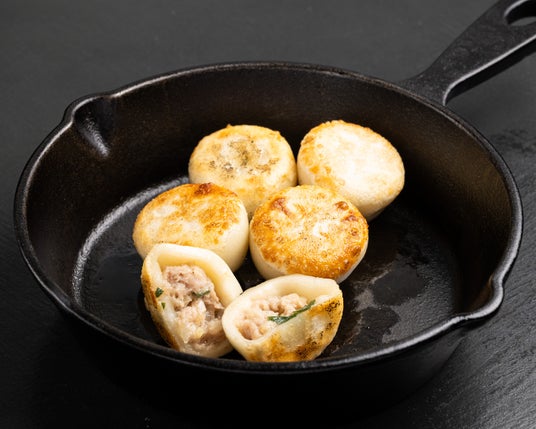 餃まる餃子のあんを、ジャガイモから作られたモチモチ食感の皮で包んだお団子のような餃子です。