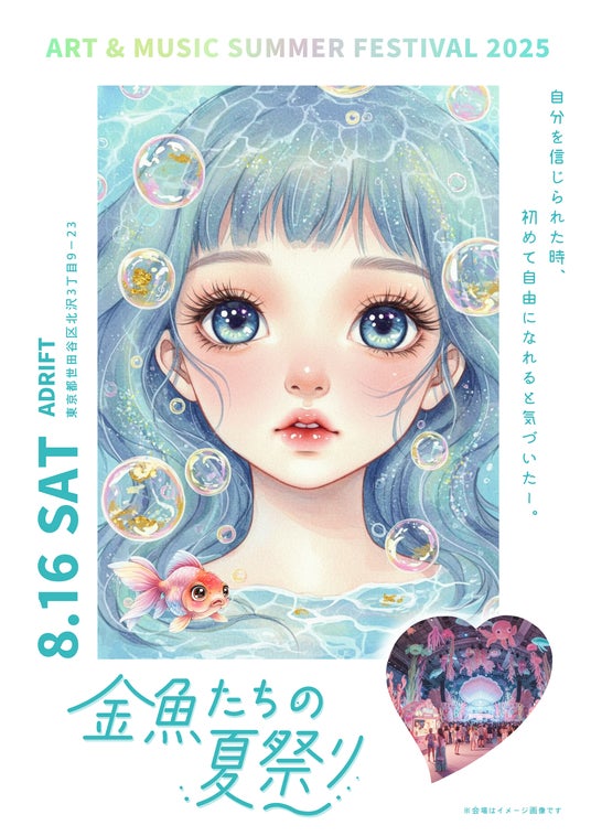 「私らしく、泳いでいこう」を合言葉に、コロナ禍に活動を開始したアート&ミュージックプロジェクト「金魚たちの夏祭り」を運営する、つながるサポート株式会社(本社:東京都世田谷区、代表取締役:矢野裕紀)は、2025年8月16日(土)に、下北沢のエンターテインメントスペース「ADRIFT」にて、「金魚たちの夏祭り2025」を開催することを決定しました。