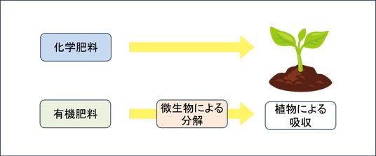 化学肥料と有機肥料それぞれの施肥後、植物が吸収する過程の違いを表す概略図。化学肥料とは異なり、有機肥料では植物が栄養として吸収するためには微生物による肥料の分解が必要となる。