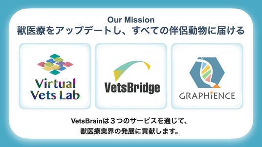 株式会社VetsBrainは、「獣医療をアップデートし、すべての伴侶動物に届ける」をミッションに掲げています。獣医療のDXを促進する診療支援サービス「VetsBridge」を軸に、動物業界特化型のコンサルティング「Virtual Vets Lab」、サイエンス・メディカル領域に特化したイラスト/アニメーション/デザイン制作「Graphience」を展開し、獣医療業界のイノベーション推進を目指しています。