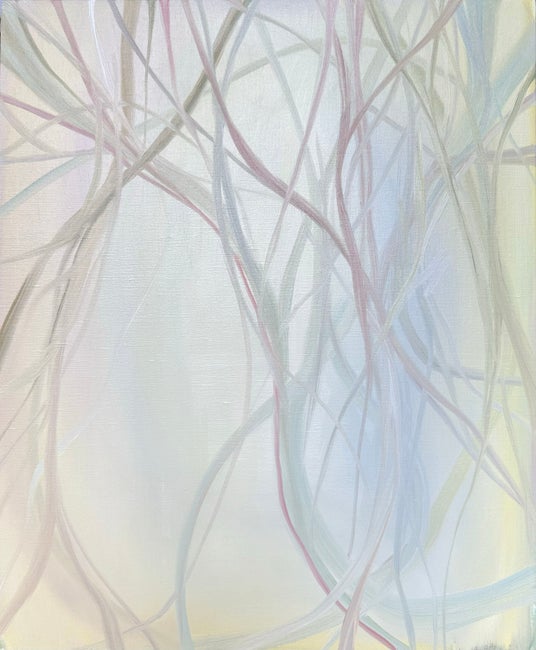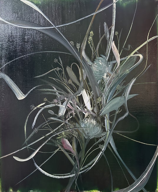 杉山歩は、2020年よりアーティストとして活動を開始し、早々にアートコンペティションで頭角を現します。2018年から一葉式いけ花第四代家元・粕谷尚弘に師事し、2023年認定教授免状を取得。いけ花における植物と時空の間(はざま)の関係性を深めていく感覚は絵を描くことと通じるといい、「花を生けるように描く」スタイルを特徴としています。