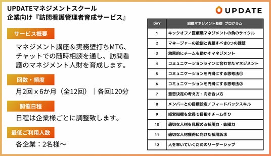 株式会社UPDATE(本社:東京都杉並区、代表取締役:小瀬文彰、以下UPDATE)は、2025年2月26日、UPDATEマネジメントスクールの企業向けプランとして『訪問看護管理者育成サービス』を開始いたします。