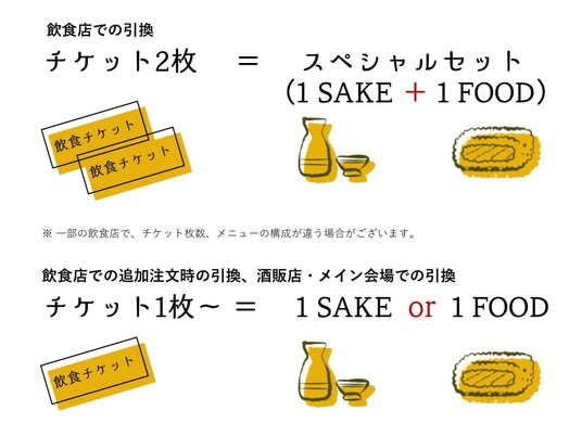 ★飲食店では原則チケット2枚とスペシャルセット(SAKE+FOOD)、酒販店・メイン会場ではチケット1枚からSAKEと引換ください。