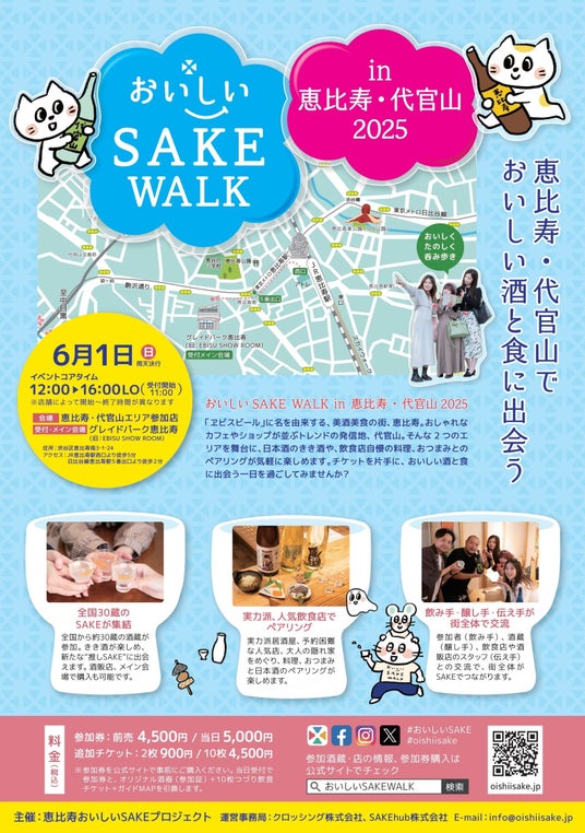恵比寿から世界へおいしい酒と食のある暮らしを提案する、恵比寿おいしいSAKEプロジェクト(代表発起人:畔柳 伸、運営事務局:クロッシング株式会社、SAKEhub株式会社)は、2023年9月、2024年11月に累計約2,000名が参加してご好評いただいた、全国の美酒と美食を楽しむ街歩きイベント【おいしいSAKE WALK in 恵比寿・代官山】を、2025年は6月1日(日)に開催します。