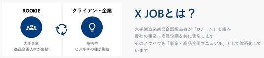株式会社ROOKIE(本社:東京都新宿区、代表取締役:山内雅仁、堀内裕樹、以下ROOKIE)は、新サービス「X JOB(かけるジョブ)」をリリースいたしました。本サービスは、ROOKIE社員との経験豊富な大手企業事業・商品企画人材がPJチームを組み、クライアント企業の新事業・新商品開発を伴走支援する、新たな「チーム型副業」サービスです。
