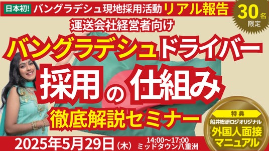 日本最大級の物流コンサルティングファーム 船井総研ロジ株式会社(本社:東京都中央区、代表:橋本直行、以下「船井総研ロジ」)は、2025年5月29日(木)14:00~17:00、 運送会社・物流会社の経営者を対象に「バングラデシュ現地採用緊急報告セミナー」を開催いたします。