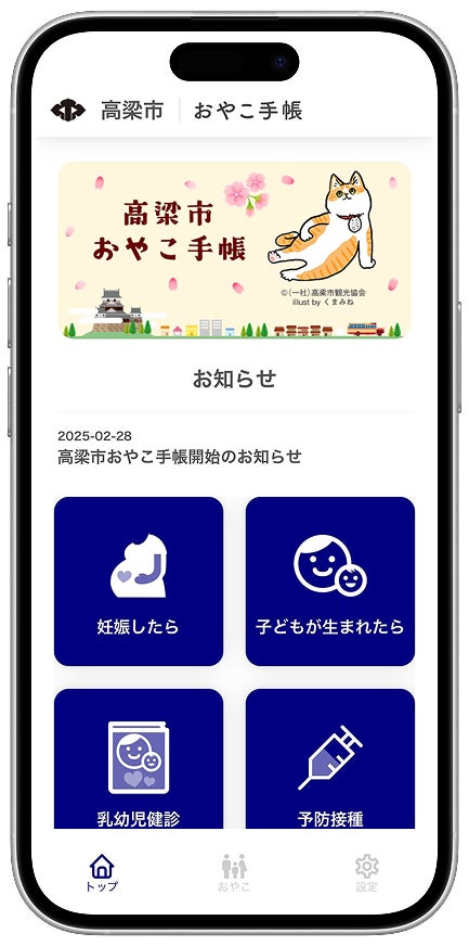 本市では昨年度「高梁市こども計画」を策定し、「こども・若者が自分らしく輝き、心豊かに成長できるまち高梁市」を基本理念としています。それぞれのライフステージに沿った支援を切れ目なく、きめ細かな施策を展開し、身体的・精神的・社会的に幸せな生活を送ることができるよう「こども施策」を推進しています。このデジタル化も予診票や健診票、記録の手間を削減し、こどもとの時間を大切に過ごしていただくよう導入いたしました。市からの子育て情報や健診等の情報もお届けしますので、ぜひご活用下さい。