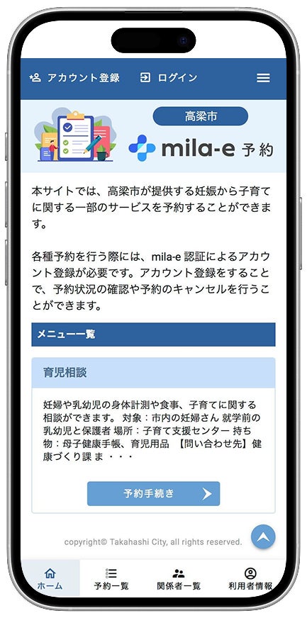mila-e おやこ手帳 TOP画面の「各種予約」からアクセス後、お持ちのmila-e認証アカウントにてログイン、利用者情報を入力し予約を行ってください。