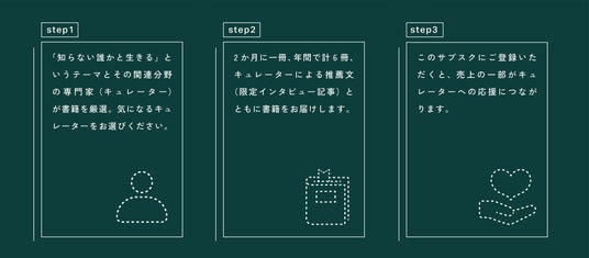 人文学、芸術、社会問題などの分野で活躍する多様なキュレーターたちが、それぞれテーマを掲げて選んだ書籍1冊に、選書への思いや推薦コメントを綴ったオリジナルテキストを添えて、読者のもとへお届けする予定。1年間を通して、最先端のキュレーターの思考を辿ることができる。