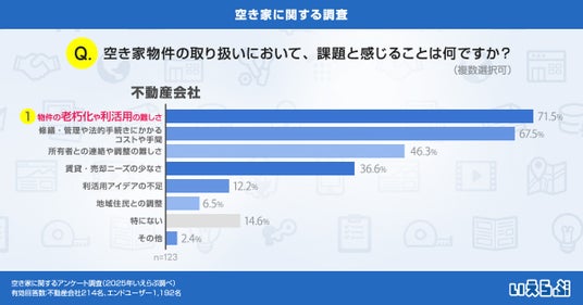 また、空き家物件の取り扱い経験がある不動産会社(※2)に「空き家物件の取り扱いにおいて、課題と感じることは何ですか?」と質問したところ、「物件の老朽化や利活用の難しさ」という回答が71.7%、「修繕・管理や法的手続きにかかるコスト」が67.5%となり、この2つの課題が特に大きいことが明らかになりました。