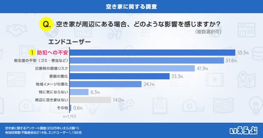 エンドユーザーに「空き家が周辺にある場合、どのような影響を感じますか?」と質問したところ、最も多かった回答は「防犯への不安」で55.5%、次いで「衛生面の不安(ゴミ・害虫など)」が51.6%、「災害時の倒壊リスク」が41.9%という結果となりました。