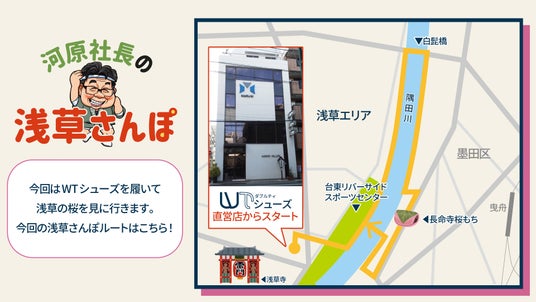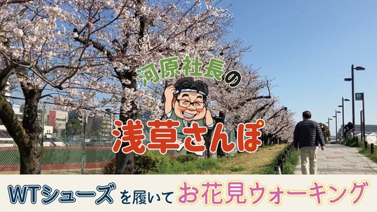 WTシューズを開発&提供する明治28年創業の老舗靴メーカー「丸喜株式会社」河原勢朗代表が地元・浅草を案内する動画をYouTubeで配信開始。初回は隅田川の桜を見ながら「お花見ウォーキング」。