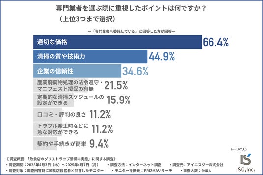 「専門業者を選ぶ際に重視したポイント」について尋ねたところ、『適切な価格(66.4%)』が最も多く、『清掃の質や技術力(44.9%)』『企業の信頼性(34.6%)』と続きました。