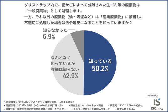 「グリストラップ内で、網かごによって分離された生ゴミ等の廃棄物は「一般廃棄物』」として処理します。一方、それ以外の廃棄物(油・汚泥など)は「産業廃棄物」に該当し、不適切に処理した場合は法令違反になることを知っているか」を尋ねたところ、以下のような回答結果になりました。