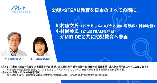 【幼児×STEAMを日本中へ】科学教育者/川村康文氏(ドラえもんのび太と空の理想郷・科学考証)、幼児教育者/小林尚美氏(幼児STEAM専門家)がMIRIDEと共に幼児教育へ参画