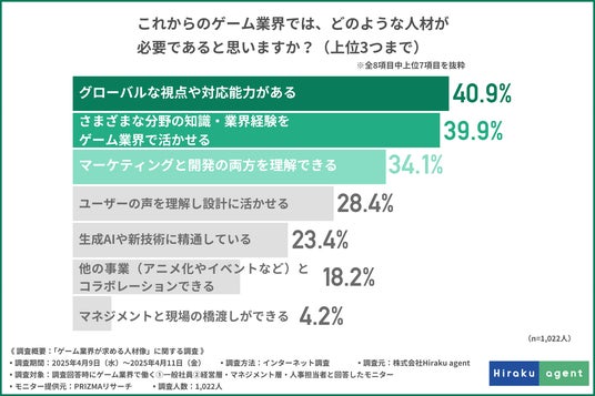最後に全員に、「今後のゲーム業界で必要とされる人材像」について尋ねたところ、『グローバルな視点や対応能力がある(40.9%)』『異分野知識や経験を活かせる(39.9%)』『マーケティングと開発の両方を理解できる(34.1%)』が上位となりました。