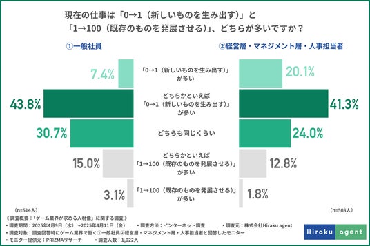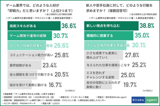 そこで今回、株式会社Hiraku agent(https://hiraku-agent.com/)は、1.ゲーム業界で働く一般社員/2.ゲーム業界の企業の経営・マネジメント層・人事担当者を対象に、「ゲーム業界が求める人材像」に関する調査を実施しました。