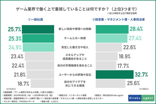 次に、ゲーム業界で働く上で重視していることを、一般社員と経営・マネジメント層・人事担当者にうかがいました。