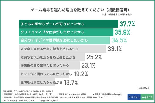 『子どもの頃からゲームが好きだったから(37.7%)』『クリエイティブな仕事がしたかったから(35.9%)』『自分のアイデアや世界観を形にしたいから(34.5%)』