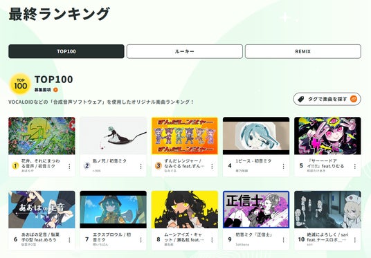 今回、約7,400件の投稿数を記録した「ボカコレランキング」では、人気ボカロPや様々なジャンルのクリエイターが一斉にボカロ動画作品を制作・投稿し、各種カテゴリでランキング順位を競い合いました。また、この作品投稿数のうち、デビュー2年以内のボカロPを対象としたルーキーランキングも過去最高となる約4,000件を記録。今回もクリエイターとユーザーの間で大きな盛り上がりを見せ、ボカロづくしの4日間となりました。なお、今回のボカコレランキングで投稿されたオリジナル楽曲は、リズム&アドベンチャーゲーム『プロジェクトセカイ カラフルステージ! feat. 初音ミク(以下、プロセカ)』とボカコレのコラボ企画「ボカセカ」(https://vocaloid-collection.jp/special/vocaseka/)や人気アイドルグループ・FRUITS ZIPPERによる歌ってみた企画(https://vocaloid-collection.jp/special/fruitszipper/)など、各種応募企画の選出対象となり、後日結果を発表します。また、上位にランクインしたほかの楽曲も、各メディアパートナーの番組内で複数オンエアされるほか、クリエイターのゲスト出演や番組テーマソングへの採用などの特別企画も予定されています。
